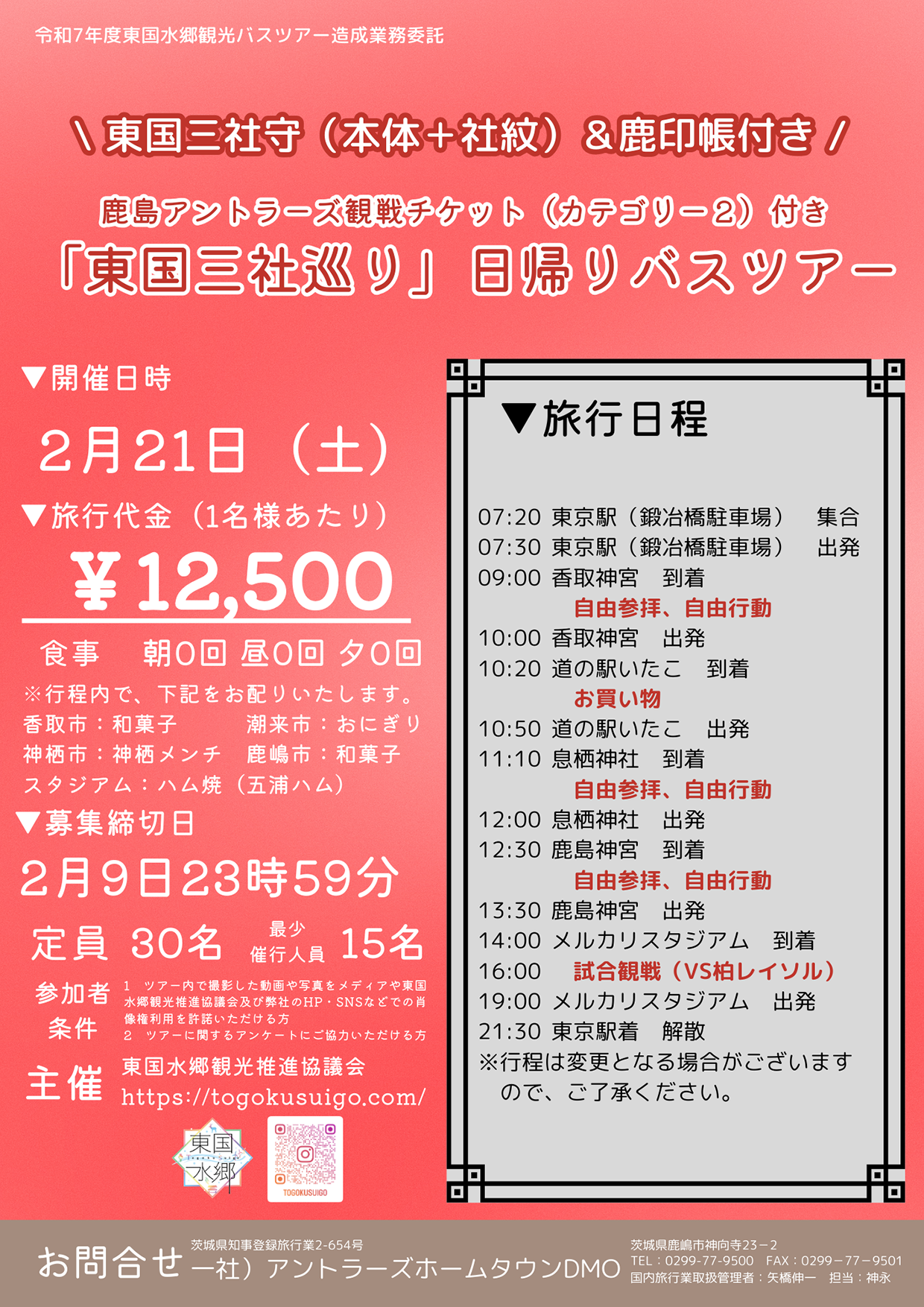 イベント情報 2026/01/29 NEW! 東国三社守&鹿印帳、 鹿島アントラーズ観戦チケット付き「東国三社巡り」日帰りバスツアー販売開始! アントラーズホームタウンDMOは東国水郷観光推進協議会の協力のもと、鹿島アントラーズのホームゲームと「東国三社巡り」、東国水郷地域のグルメをセットにしたおたのしみツアーを企画しました。 詳しくはこちら | イベント情報一覧 | カテゴリー ・観光情報 ・イベント情報 ・ニュースリリース ・活動報告 ・メディア掲載 ・その他 アーカイブ 2026年1月 2025年11月 2025年10月 2025年9月 2025年7月 2024年5月 2024年4月 2024年3月 2023年8月 2021年12月 2021年11月 2021年10月